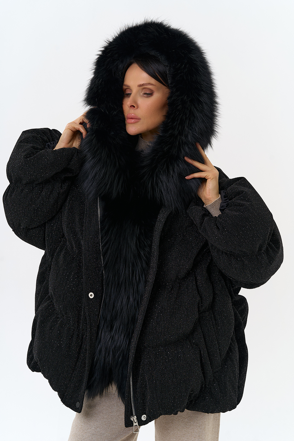 Крой воротника - капюшон, отделка чернобурка