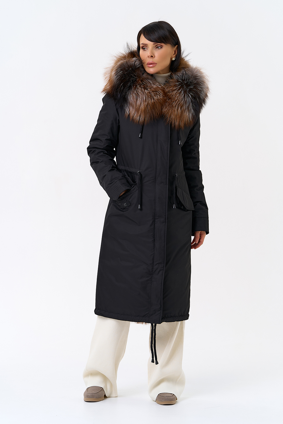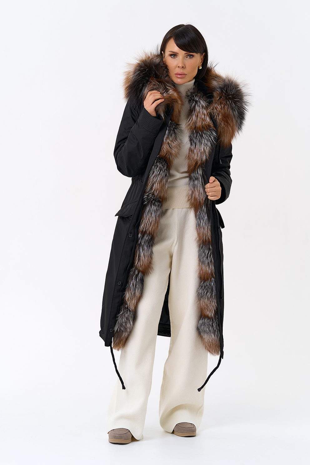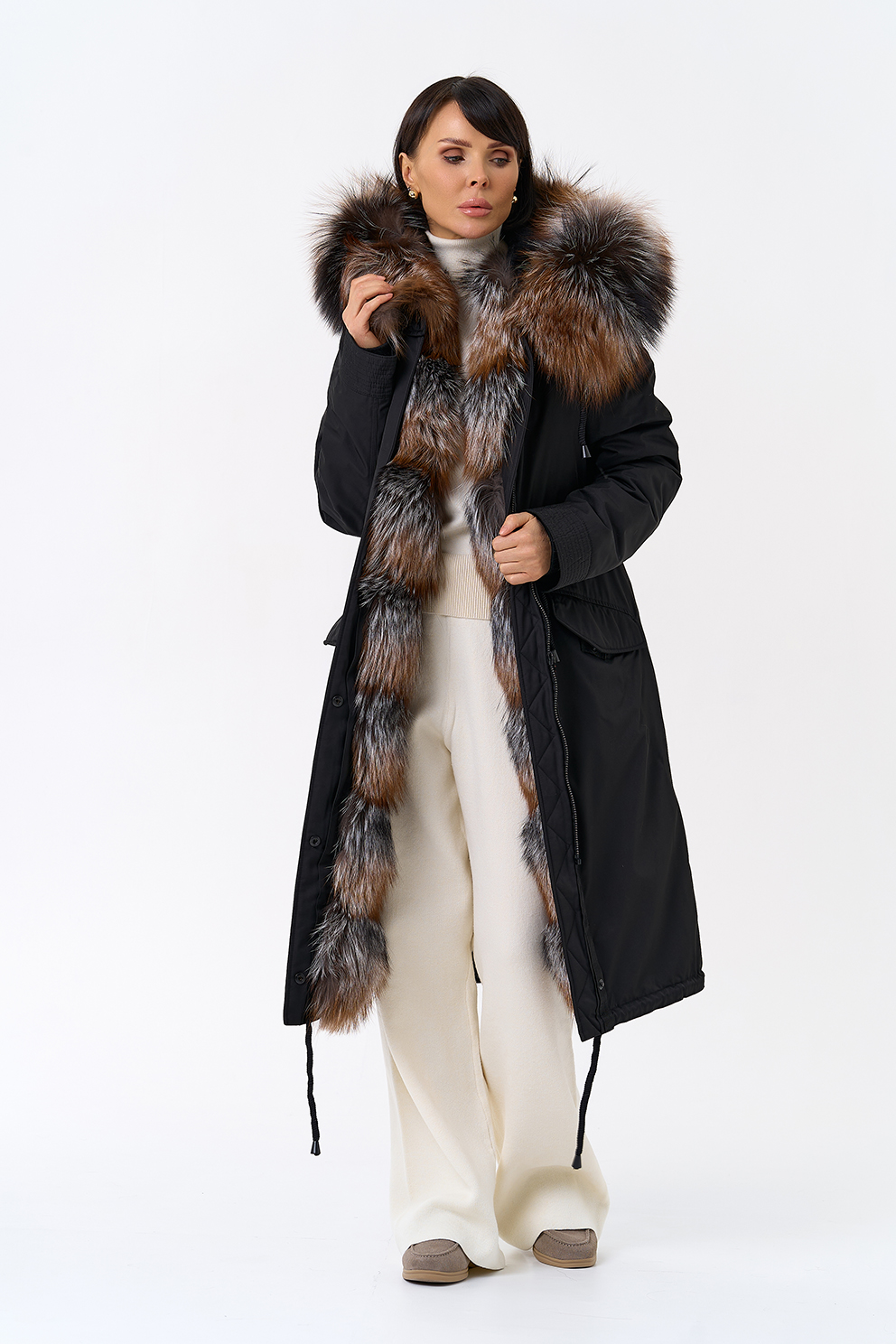 Крой воротника - капюшон, отделка чернобурая лиса Otoban, овчина